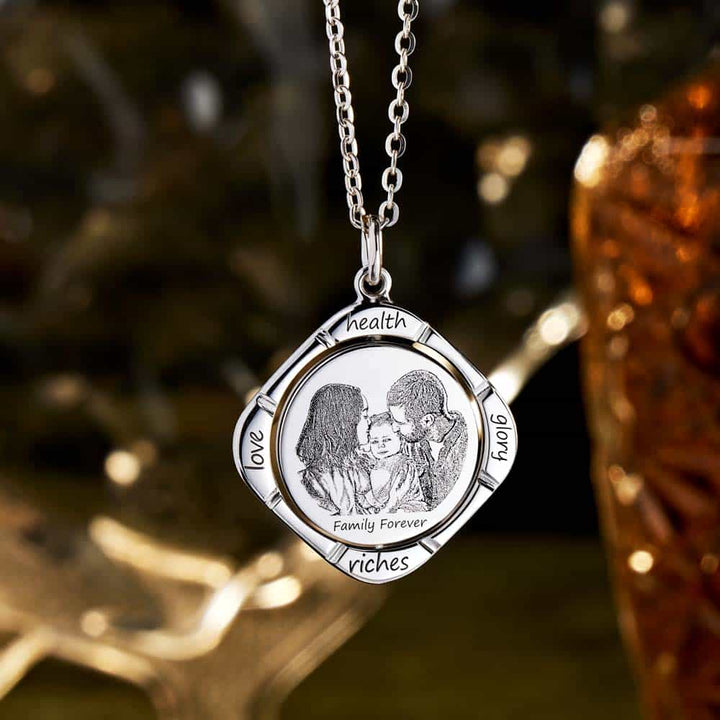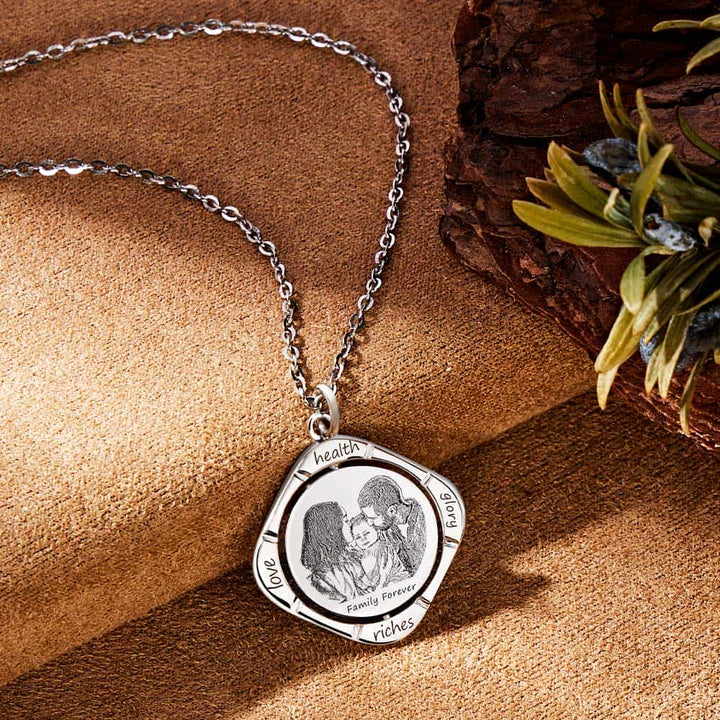 Entdecken Sie die zeitlose Eleganz unserer personalisierten Skizzen Foto Kette, die Ihre schönsten Erinnerungen in eleganter, tragbarer Form bewahrt. Die Vorderseite des Anhängers zeigt Ihr ausgewähltes Foto, fachmännisch als raffinierte Skizze eingraviert. So werden selbst kleinste Details präzise festgehalten und ein persönliches, langlebiges Andenken geschaffen.