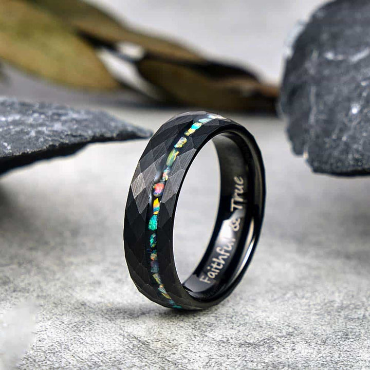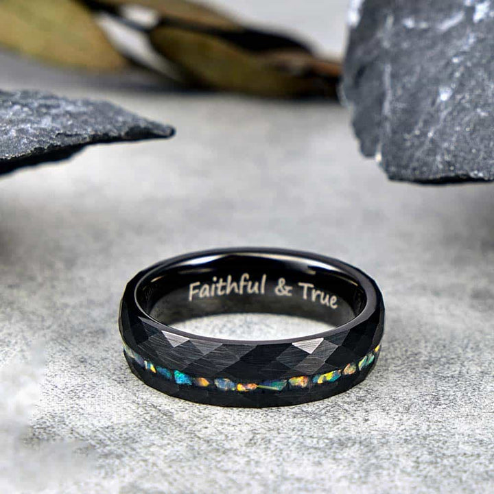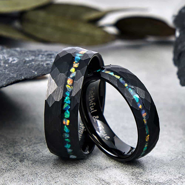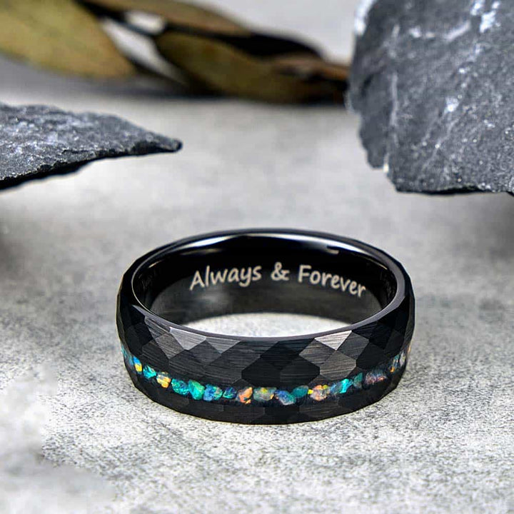 Gehämmerter Wolfram Ehering mit Opalen - Spektrum Wandel