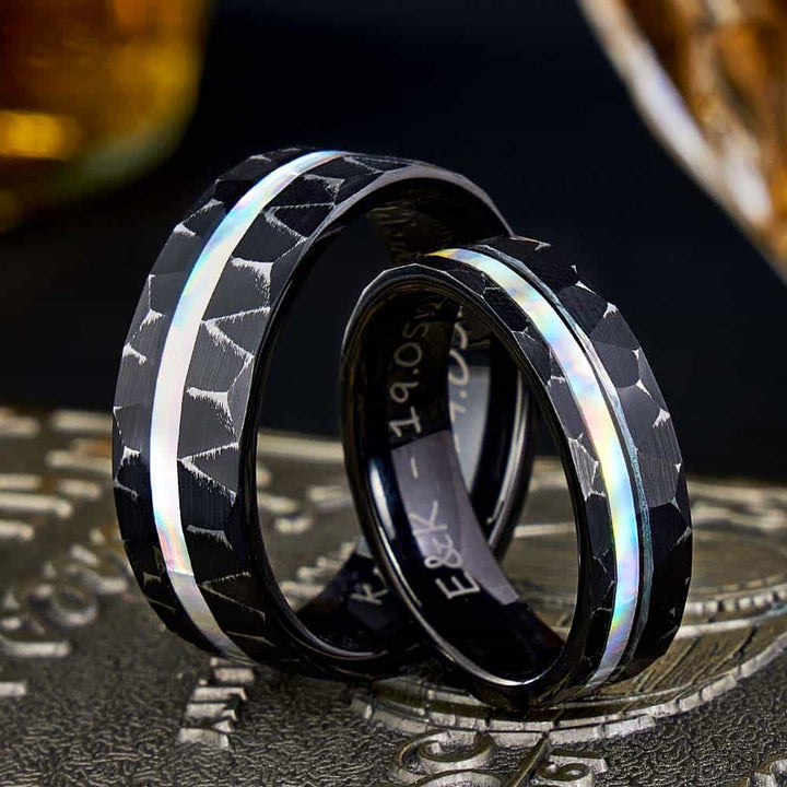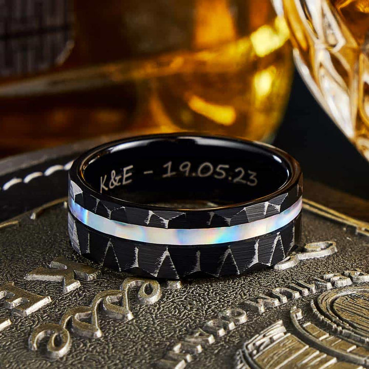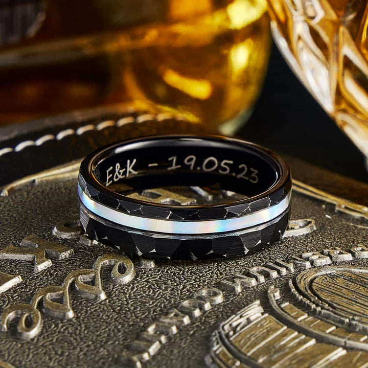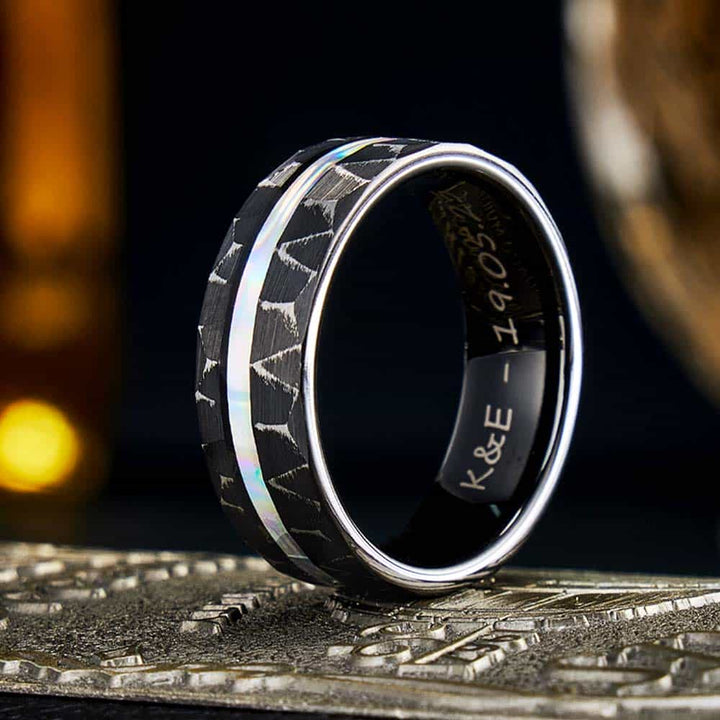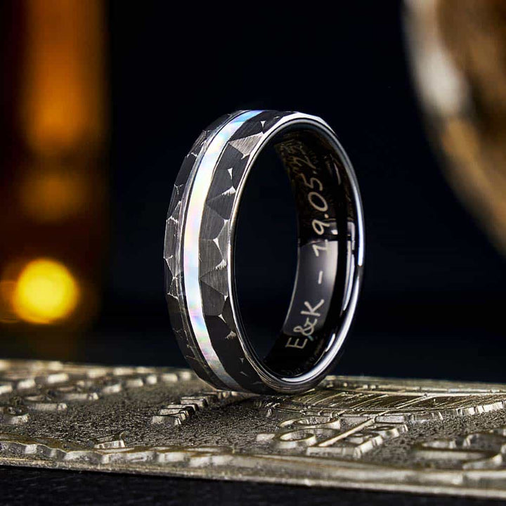 Gehämmerter Wolfram Ehering mit Perlmutt - Finsternis