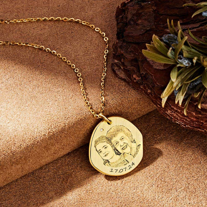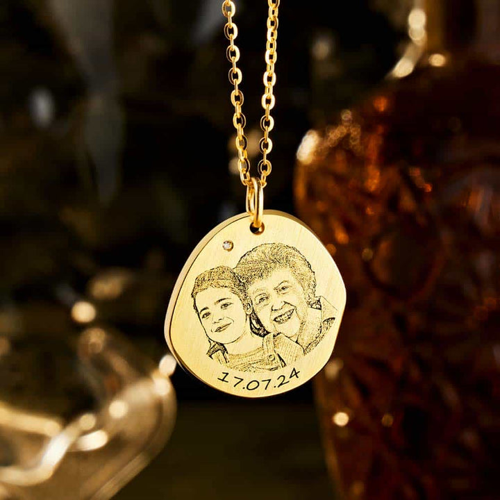 Entdecken Sie die zeitlose Eleganz unserer personalisierten Skizzen Foto Kette, die Ihre schönsten Erinnerungen in eleganter, tragbarer Form bewahrt. Die Vorderseite des Anhängers zeigt Ihr ausgewähltes Foto, fachmännisch als raffinierte Skizze eingraviert. So werden selbst kleinste Details präzise festgehalten und ein persönliches, langlebiges Andenken geschaffen.
