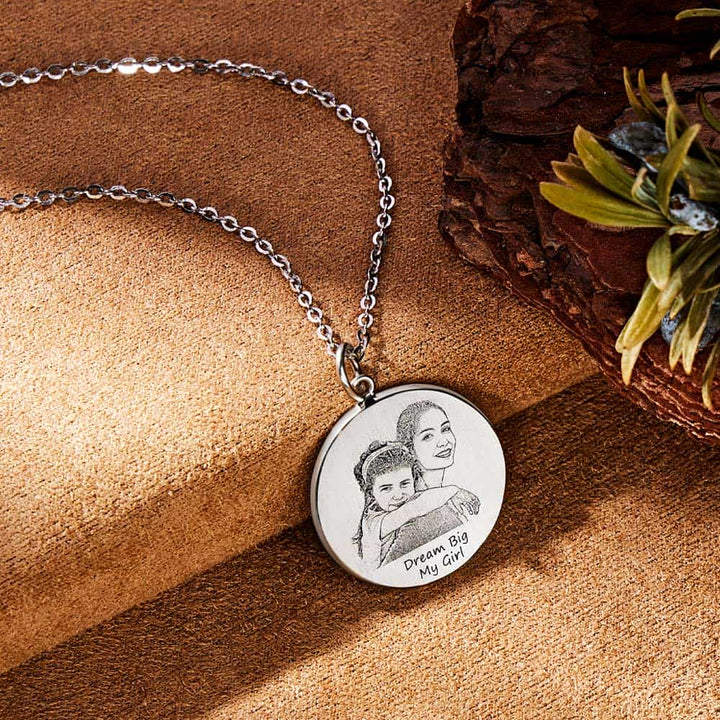 Entdecken Sie die zeitlose Eleganz unserer personalisierten Skizzen Foto Kette, die Ihre schönsten Erinnerungen in eleganter, tragbarer Form bewahrt. Die Vorderseite des Anhängers zeigt Ihr ausgewähltes Foto, fachmännisch als raffinierte Skizze eingraviert. So werden selbst kleinste Details präzise festgehalten und ein persönliches, langlebiges Andenken geschaffen.
