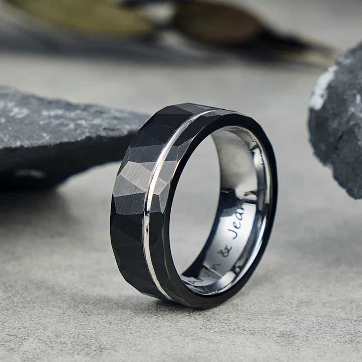 Heben Sie Ihren Stil auf ein neues Niveau mit einem gehämmerten schwarzen Wolframring, gravierbar im Innenring, verfügbar in 6mm und 8mm. Dieses elegante Schmuckstück vereint eine robuste Langlebigkeit mit einem einzigartigen Design, das jedem Outfit eine stilvolle Note verleiht. Die gehämmerte Oberfläche sorgt für eine faszinierende Textur und ein markantes Aussehen, das alle Blicke auf sich zieht.