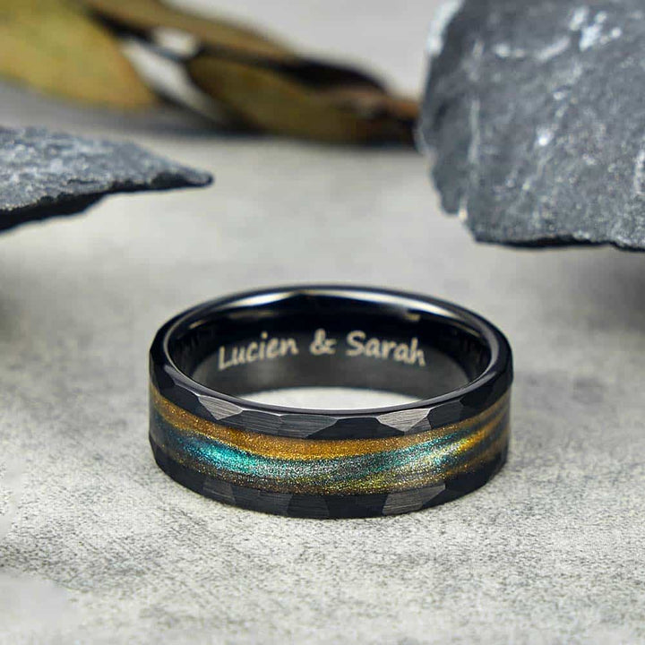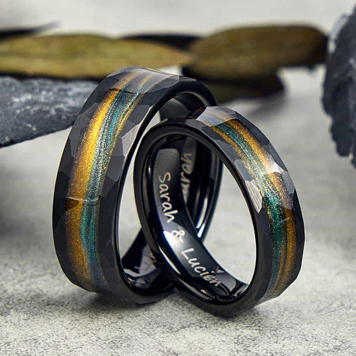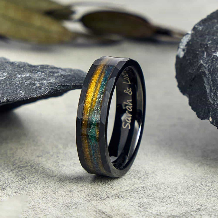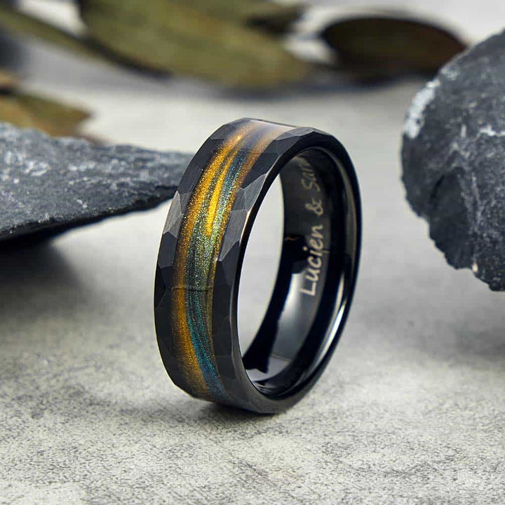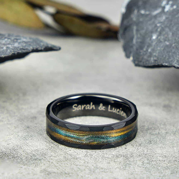 Heben Sie Ihren Stil auf ein neues Niveau mit einem facetten schwarzen Wolfram Ring, gravierbar im Innenring, verfügbar in 6mm und 8mm. Dieses elegante Schmuckstück vereint eine robuste Langlebigkeit mit einem einzigartigen Design, das jedem Outfit eine stilvolle Note verleiht. Die gehämmerte Oberfläche sorgt für eine faszinierende Textur und ein markantes Aussehen, das alle Blicke auf sich zieht.